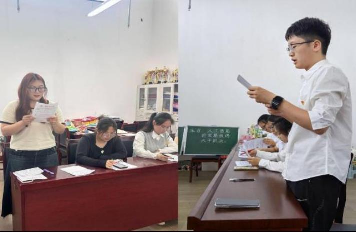 汉语言文学专业学生第一党支部代表的正方观点为“人工智能的发展机遇大于挑战”,汉语言文学专业学生第二党支部代表的反方观点为“人工智能的发展挑战大于机遇”。双方各派五名辩手,由顾代飞同志主持,支部书记张颖颖、支部书记李应华担任评委。