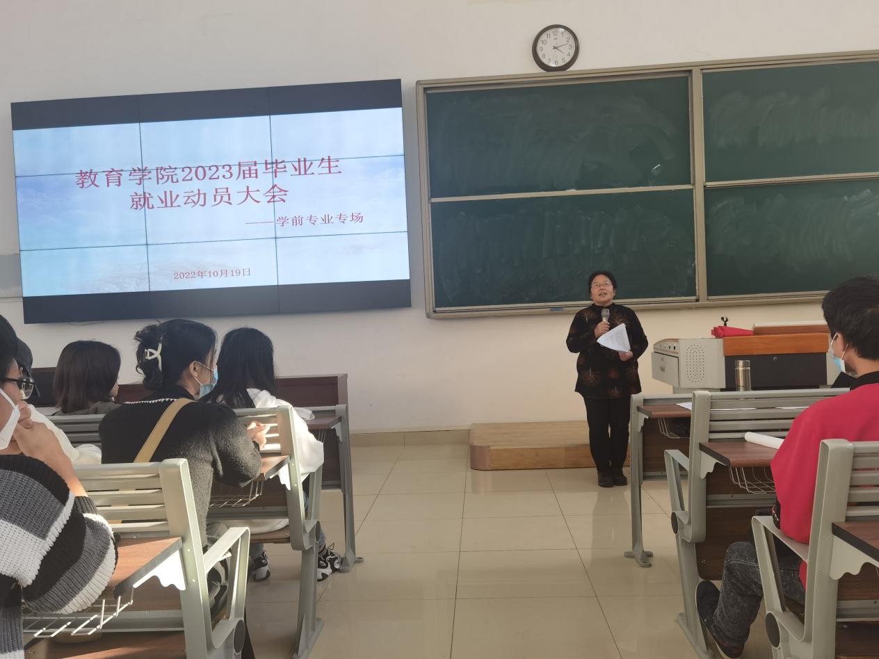 2022年10月19日下午,买球官网在教学楼121教室召开2023届毕业生就业动员大会。为帮助2023届毕业生准确有效地确定就业方向,尽快地让同学们在思想、行动上早做准备,指导毕业生如何走好从大学走向社会的重要一步。外围买球的app十大平台王家云院长、孟向红副书记及学前教研组老师出席本次会议,2023届外围买球的app十大平台学前教育专业全体毕业生参加会议。会议分两场进行,分别由外围买球的app十大平台学前教育专业辅导员任若晨、侯莉萍主持。