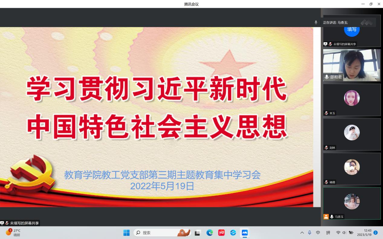 5月19日下午,外围买球的app十大平台学习贯彻习近平新时代中国特色社会主义思想主题教育开展第三期读书班党课学习,本次学习会以“线上课堂”形式举行,由教工党支部委员邵和君同志主持并领学。