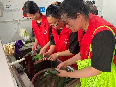 实践团队成员在托老院工作人员的安排和协助下,与工作人员一道为老人们包粽子,准备节日食材。成员中很多同学都是第一次动手包粽子,既兴奋又不知从何下手,在工作人员的指导下,捋粽叶、做漏斗、填糯米、压紧实、封口、扎捆,同学们在实践中体会到劳动的快乐与节日的氛围,一片片清香的粽叶、粒粒晶莹的糯米,在实践团队的巧手下变成了一个个诱人的粽子。