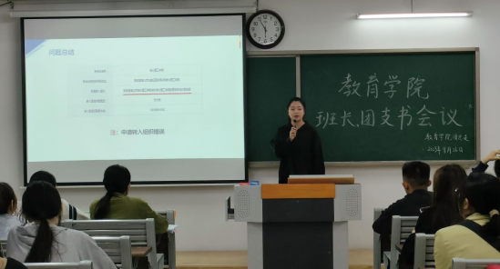 最后,学院学生会代表张蕊同学向大家介绍了关于智慧团建转接存在的问题及转接流程,耐心解答各位团支书的疑问,让班委更加熟悉其中的操作方法,进一步做好新生团员关系的转接工作。学生会文体部胡卫婷同学介绍新生班级大合唱注意事项,并对合唱曲目主题的选择做出说明,她强调排练大合唱是一次凝聚班级团结力、向心力的最好时机,同时希望各班级以昂扬的风采、饱满的精神状态参加比赛。