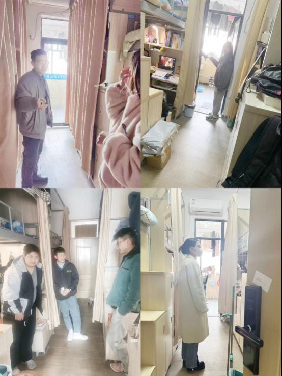 走访中,辅导员们仔细检查了宿舍的安全状况和卫生状况,对窗户、墙面、地面、桌面等区域进行了仔细查看。大部分宿舍的卫生状况良好,物品摆放整齐。但也发现了部分宿舍存在卫生问题,如垃圾未及时清理、门口堆放物品较多等方面问题。辅导员老师们走访中询问了解了同学们开学以来的学习生活情况,对干净整洁、卫生状况优良的寝室及时给予了口头表扬,对寝室检查中发现的问题和不足,要求同学们对照“文明寝室创建”的标准及时整改到位。